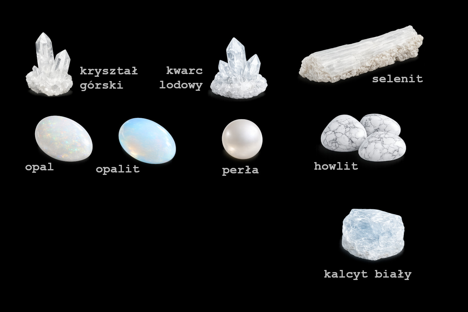 Białe / przejrzyste kryształy - kwarc, selenit, opal.